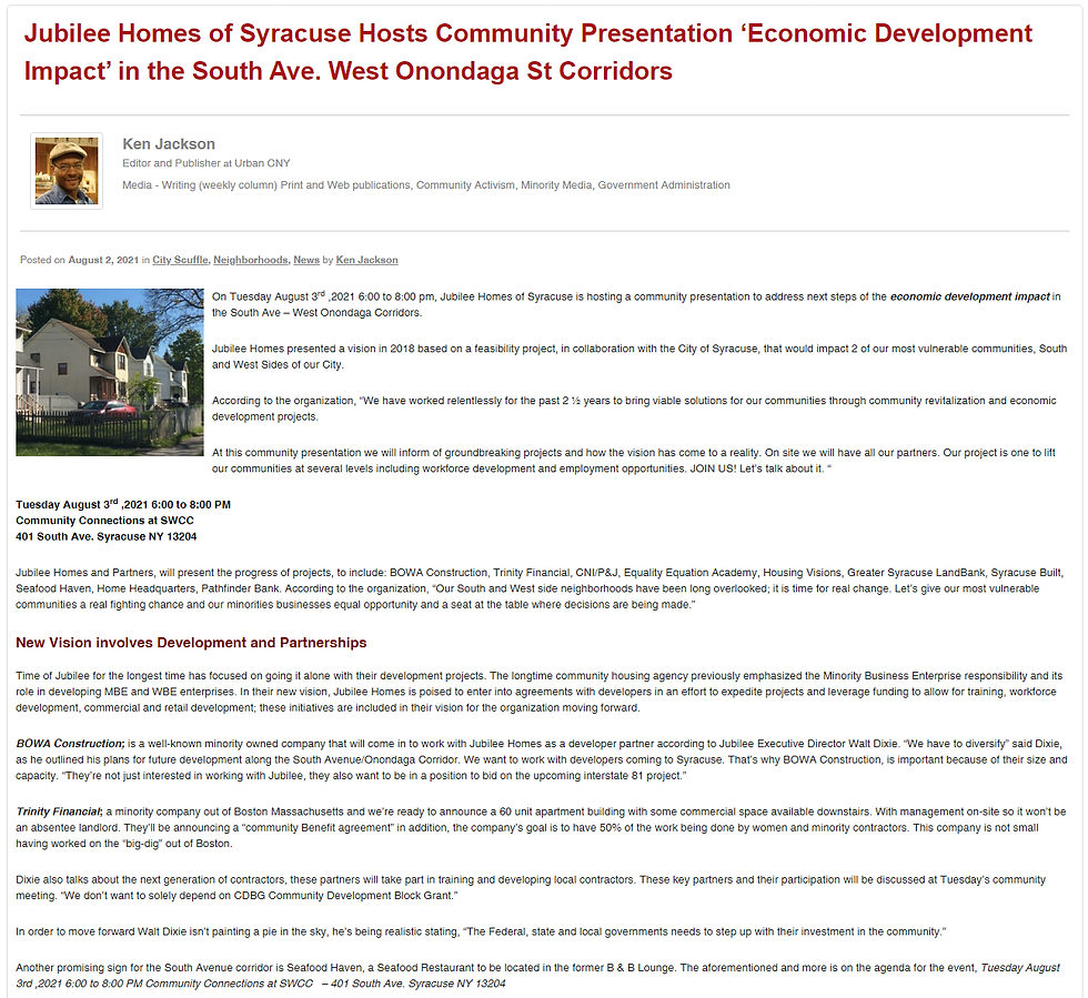 Great article on Urban CNYMadea HolmanAug 3, 20211 min readhttps://www.urbancny.com/jubilee-homes-of-syracuse-hosts-community-presentation-economic-development-impact-in-the-south-ave-west-onondaga-st-corridors/